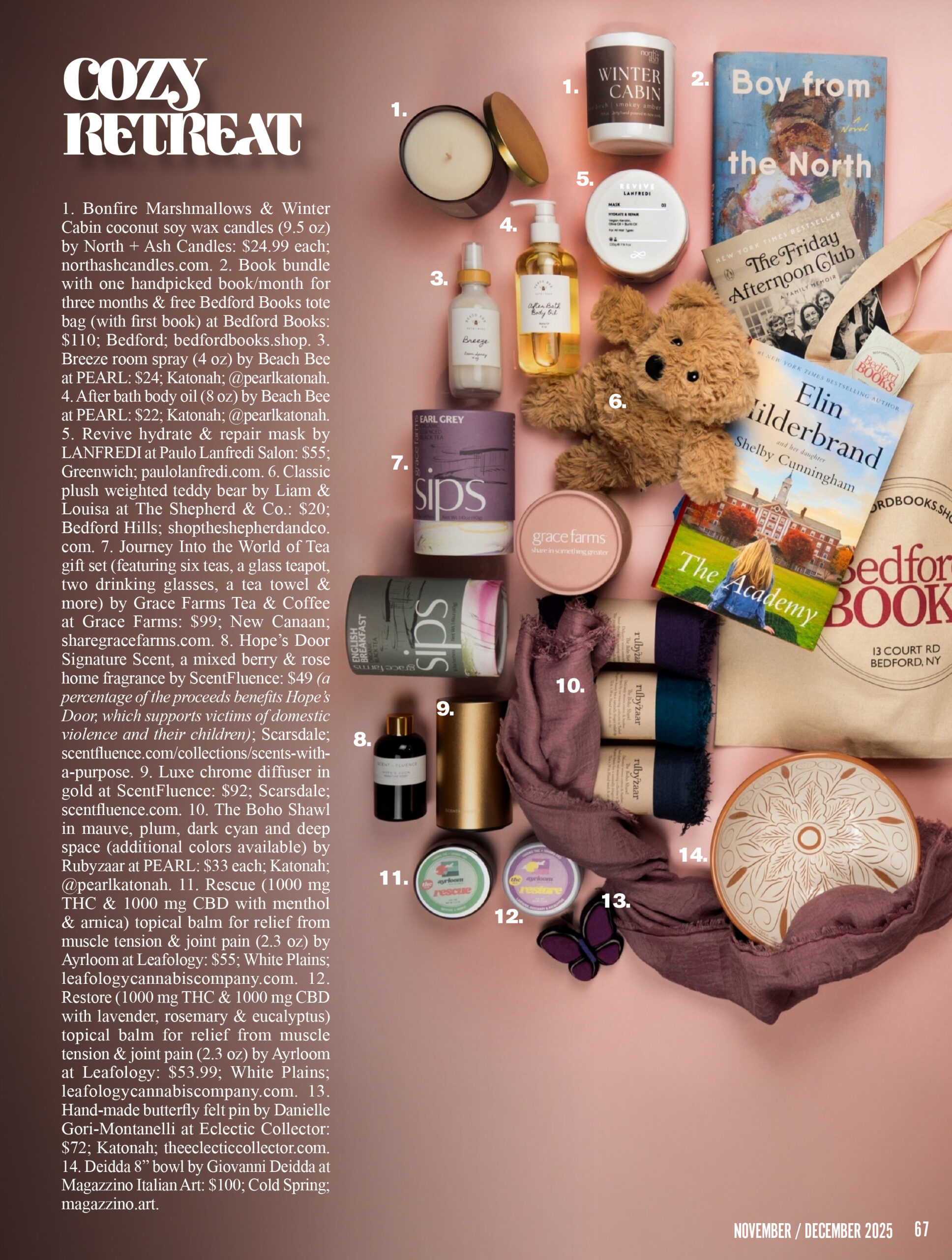 7. Journey Into the World of Tea gift set (featuring six teas, a glass teapot, two drinking glasses, a tea towel & more) by Grace Farms Tea & Coffee at Grace Farms: $99; New Canaan; sharegracefarms.com.8. Hope’s Door Signature Scent, a mixed berry & rose home fragrance by ScentFluence: $49 (a percentage of the proceeds benefits Hope’s Door, which supports victims of domestic violence and their children); Scarsdale; scentfluence.com/collections/scents-with-a-purpose.