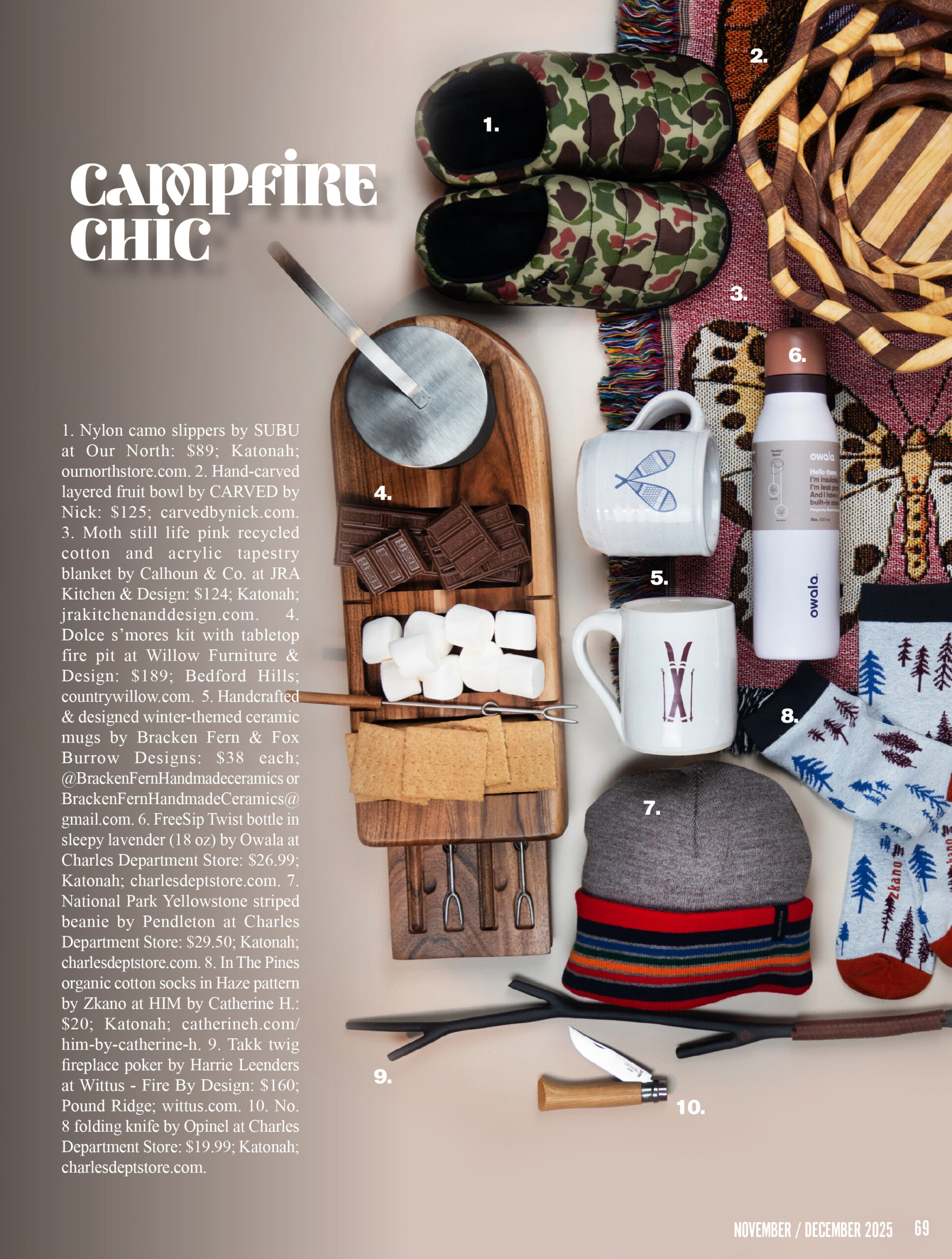 1. Nylon camo slippers by SUBU at Our North: $89; Katonah; ournorthstore.com. 2. Hand-carved layered fruit bowl by CARVED by Nick: $125; carvedbynick.com. 3. Moth still life pink recycled cotton and acrylic tapestry blanket by Calhoun & Co. at JRA Kitchen & Design: $124; Katonah; jrakitchenanddesign.com. 4. Dolce s’mores kit with tabletop fire pit at Willow Furniture & Design: $189; Bedford Hills; countrywillow.com. 5. Handcrafted & designed winter-themed ceramic mugs by Bracken Fern & Fox Burrow Designs: $38 each; @BrackenFernHandmadeceramics or [email protected]. 6. FreeSip Twist bottle in sleepy lavender (18 oz) by Owala at Charles Department Store: $26.99; Katonah; charlesdeptstore.com. 7. National Park Yellowstone striped beanie by Pendleton at Charles Department Store: $29.50; Katonah; charlesdeptstore.com. 8. In The Pines organic cotton socks in Haze pattern by Zkano at HIM by Catherine H.: $20; Katonah; catherineh.com/him-by-catherine-h. 9. Takk twig fireplace poker by Harrie Leenders at Wittus – Fire By Design: $160; Pound Ridge; wittus.com. 10. No. 8 folding knife by Opinel at Charles Department Store: $19.99; Katonah; charlesdeptstore.com.