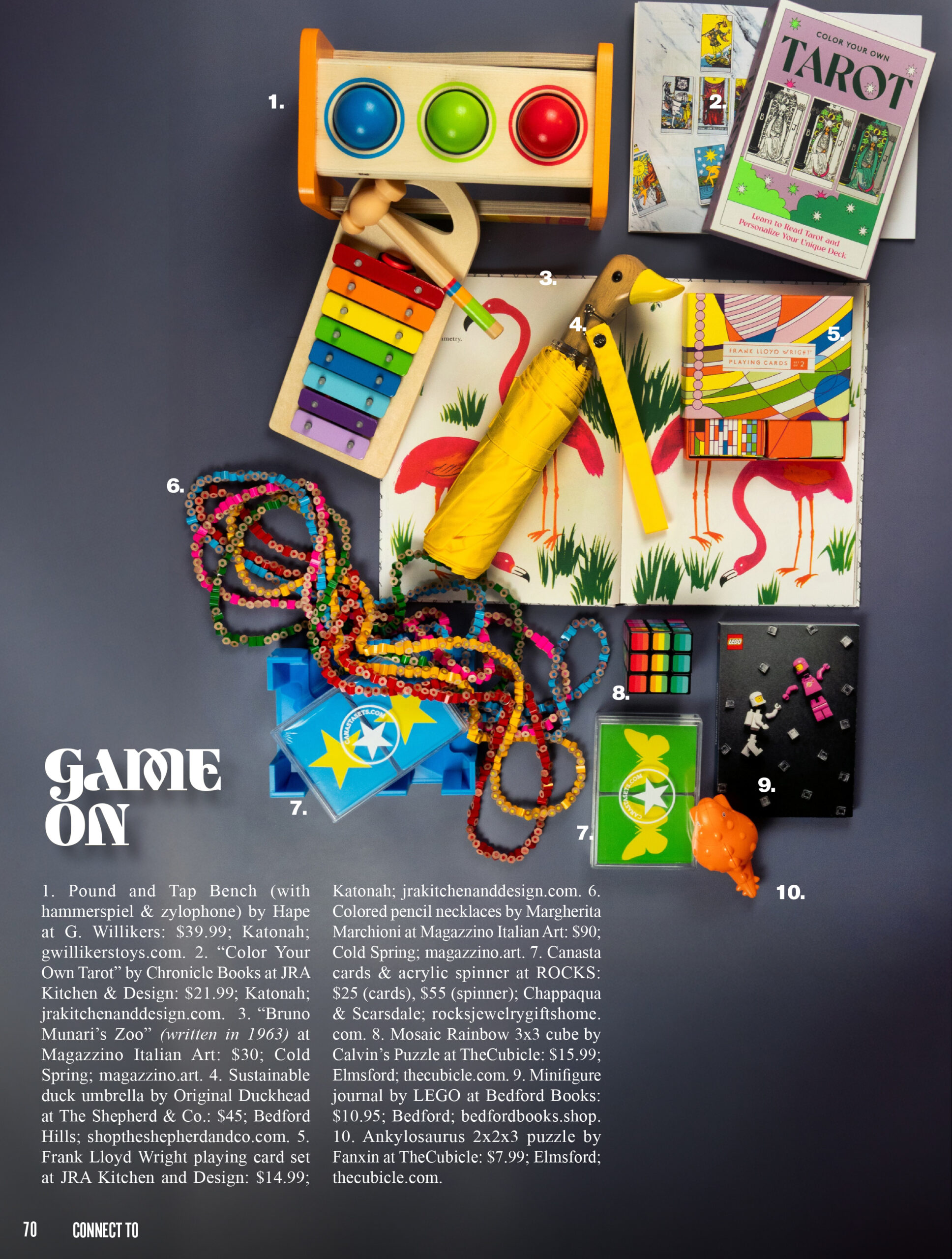 1. Pound and Tap Bench (with hammerspiel & zylophone) by Hape at G. Willikers: $39.99; Katonah; gwillikerstoys.com. 2. “Color Your Own Tarot” by Chronicle Books at JRA Kitchen & Design: $21.99; Katonah; jrakitchenanddesign.com. 3. “Bruno Munari’s Zoo” (written in 1963) at Magazzino Italian Art: $30; Cold Spring; magazzino.art. 4. Sustainable duck umbrella by Original Duckhead at The Shepherd & Co.: $45; Bedford Hills; shoptheshepherdandco.com. 5. Frank Lloyd Wright playing card set at JRA Kitchen and Design: $14.99; Katonah; jrakitchenanddesign.com. 6. Colored pencil necklaces by Margherita Marchioni at Magazzino Italian Art: $90; Cold Spring; magazzino.art. 7. Canasta cards & acrylic spinner at ROCKS: $25 (cards), $55 (spinner); Chappaqua & Scarsdale; rocksjewelrygiftshome.com. 8. Mosaic Rainbow 3×3 cube by Calvin’s Puzzle at TheCubicle: $15.99; Elmsford; thecubicle.com. 9. Minifigure journal by LEGO at Bedford Books: $10.95; Bedford; bedfordbooks.shop. 10. Ankylosaurus 2x2x3 puzzle by Fanxin at TheCubicle: $7.99; Elmsford; thecubicle.com.