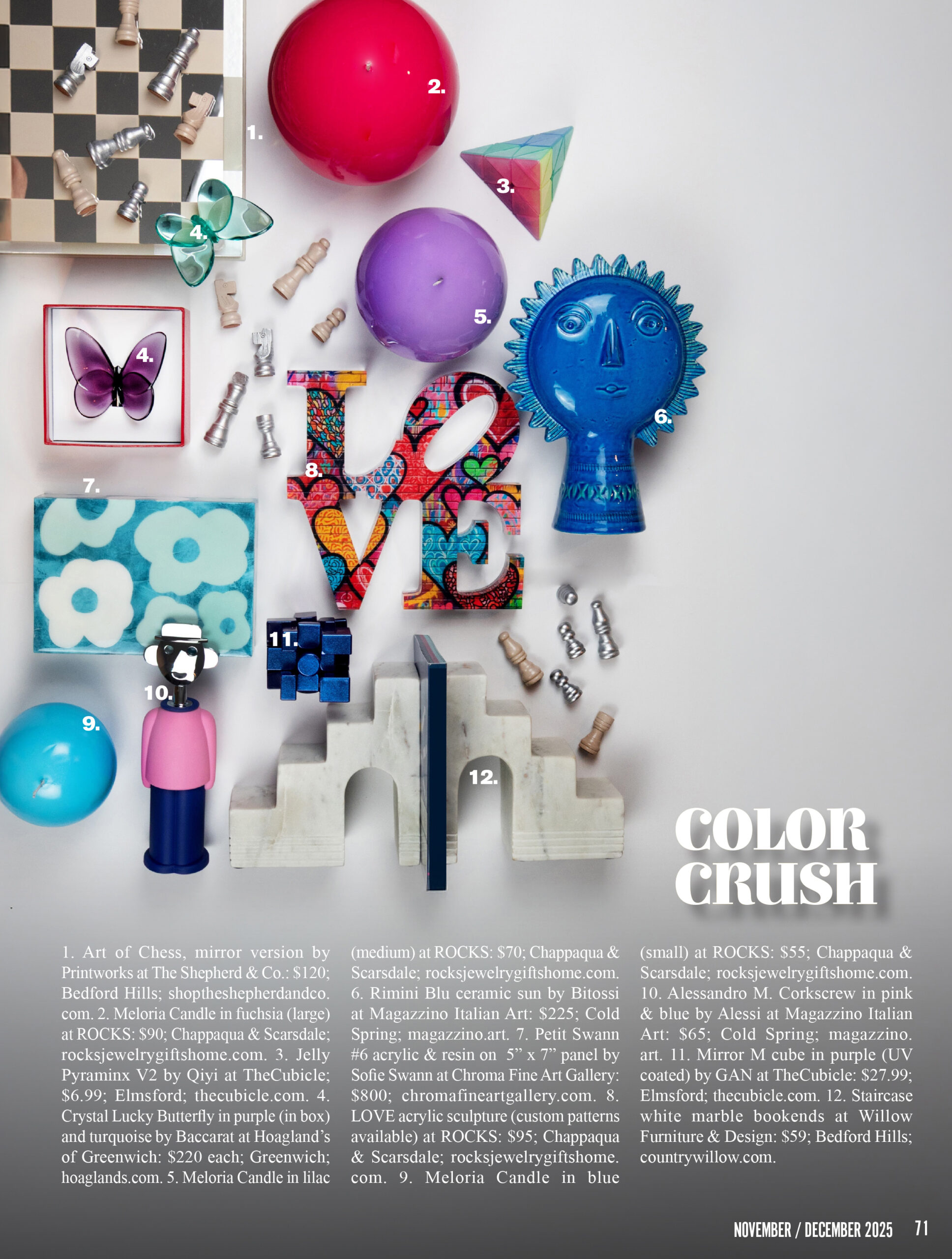 1. Art of Chess, mirror version by Printworks at The Shepherd & Co.: $120; Bedford Hills; shoptheshepherdandco.com. 2. Meloria Candle in fuchsia (large) at ROCKS: $90; Chappaqua & Scarsdale; rocksjewelrygiftshome.com. 3. Jelly Pyraminx V2 by Qiyi at TheCubicle; $6.99; Elmsford; thecubicle.com. 4. Crystal Lucky Butterfly in purple (in box) and turquoise by Baccarat at Hoagland’s of Greenwich: $220 each; Greenwich; hoaglands.com. 5. Meloria Candle in lilac (medium) at ROCKS: $70; Chappaqua & Scarsdale; rocksjewelrygiftshome.com. 6. Rimini Blu ceramic sun by Bitossi at Magazzino Italian Art: $225; Cold Spring; magazzino.art. 7. Petit Swann #6 acrylic & resin on 5” x 7” panel by Sofie Swann at Chroma Fine Art Gallery: $800; chromafineartgallery.com. 8. LOVE acrylic sculpture (custom patterns available) at ROCKS: $95; Chappaqua & Scarsdale; rocksjewelrygiftshome.com. 9. Meloria Candle in blue (small) at ROCKS: $55; Chappaqua & Scarsdale; rocksjewelrygiftshome.com. 10. Alessandro M. Corkscrew in pink & blue by Alessi at Magazzino Italian Art: $65; Cold Spring; magazzino.art. 11. Mirror M cube in purple (UV coated) by GAN at TheCubicle: $27.99; Elmsford; thecubicle.com. 12. Staircase white marble bookends at Willow Furniture & Design: $59; Bedford Hills; countrywillow.com.