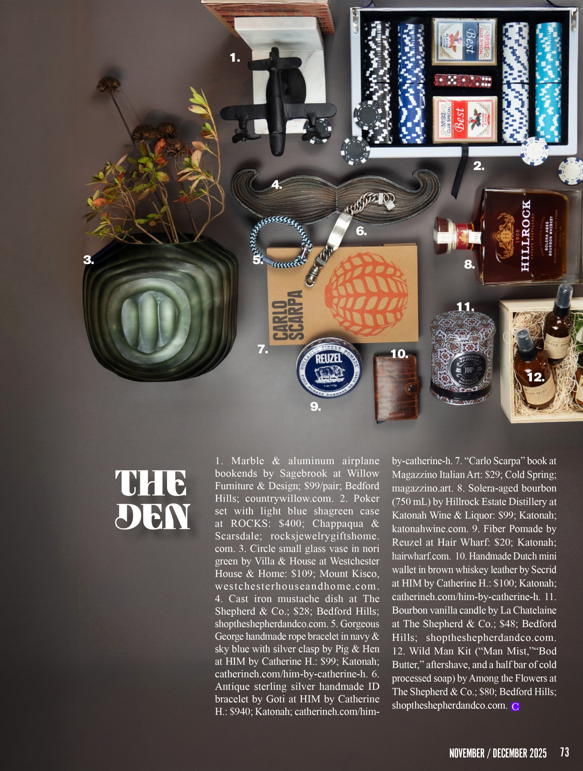 1. Marble & aluminum airplane bookends by Sagebrook at Willow Furniture & Design; $99/pair; Bedford Hills; countrywillow.com. 2. Poker set with light blue shagreen case at ROCKS: $400; Chappaqua & Scarsdale; rocksjewelrygiftshome.com. 3. Circle small glass vase in nori green by Villa & House at Westchester House & Home: $109; Mount Kisco, westchesterhouseandhome.com. 4. Cast iron mustache dish at The Shepherd & Co.; $28; Bedford Hills; shoptheshepherdandco.com. 5. Gorgeous George handmade rope bracelet in navy & sky blue with silver clasp by Pig & Hen at HIM by Catherine H.: $99; Katonah; catherineh.com/him-by-catherine-h. 6. Antique sterling silver handmade ID bracelet by Goti at HIM by Catherine H.: $940; Katonah; catherineh.com/him-by-catherine-h. 7. “Carlo Scarpa” book at Magazzino Italian Art: $29; Cold Spring; magazzino.art. 8. Solera-aged bourbon (750 mL) by Hillrock Estate Distillery at Katonah Wine & Liquor: $99; Katonah; katonahwine.com. 9. Fiber Pomade by Reuzel at Hair Wharf: $20; Katonah; hairwharf.com. 10. Handmade Dutch mini wallet in brown whiskey leather by Secrid at HIM by Catherine H.: $100; Katonah; catherineh.com/him-by-catherine-h. 11. Bourbon vanilla candle by La Chatelaine at The Shepherd & Co.; $48; Bedford Hills; shoptheshepherdandco.com. 12. Wild Man Kit (“Man Mist,”“Bod Butter,” aftershave, and a half bar of cold processed soap) by Among the Flowers at The Shepherd & Co.; $80; Bedford Hills; shoptheshepherdandco.com.