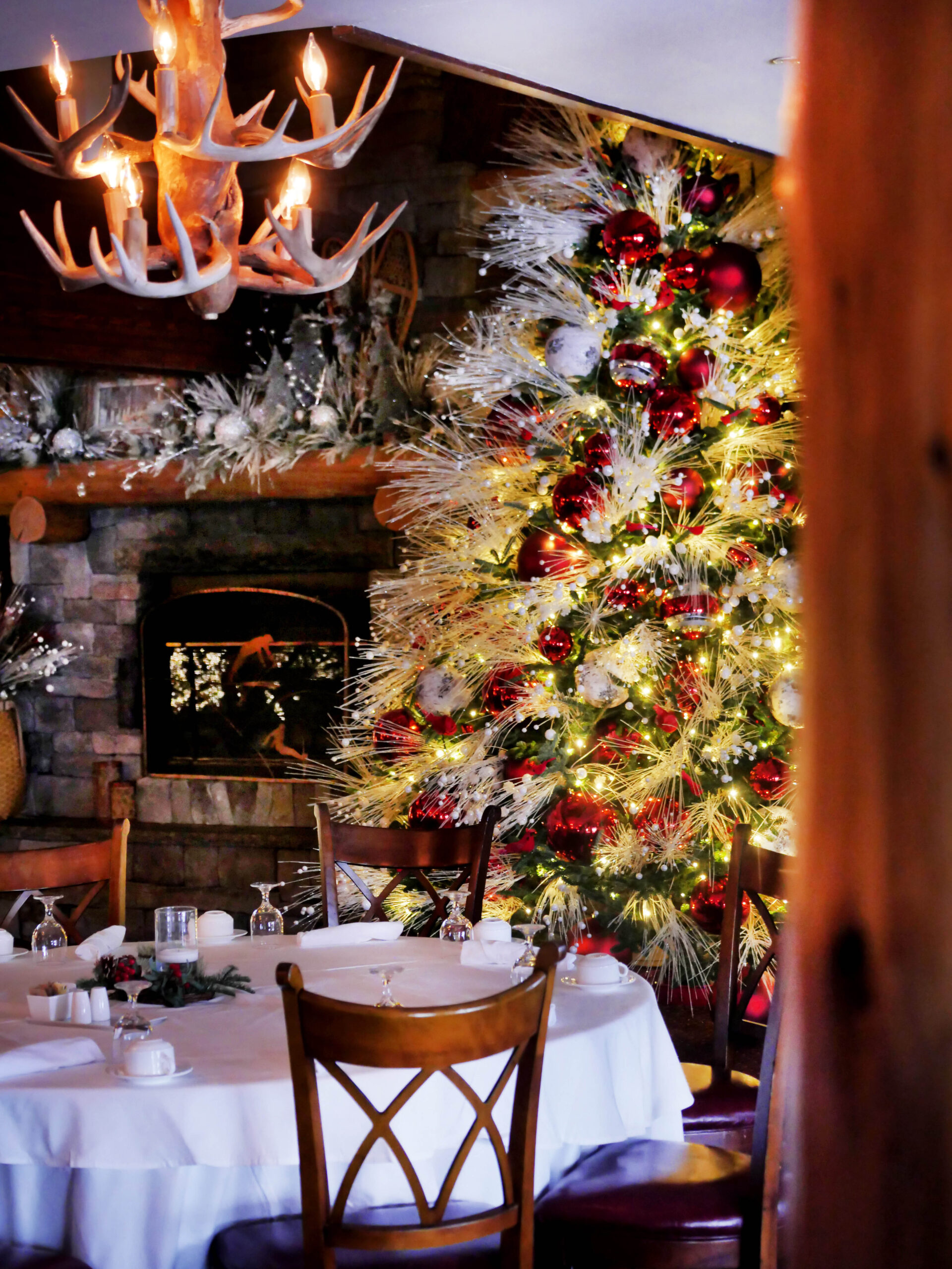 A dining room and Christmas tree at the Mirror Lake Inn.