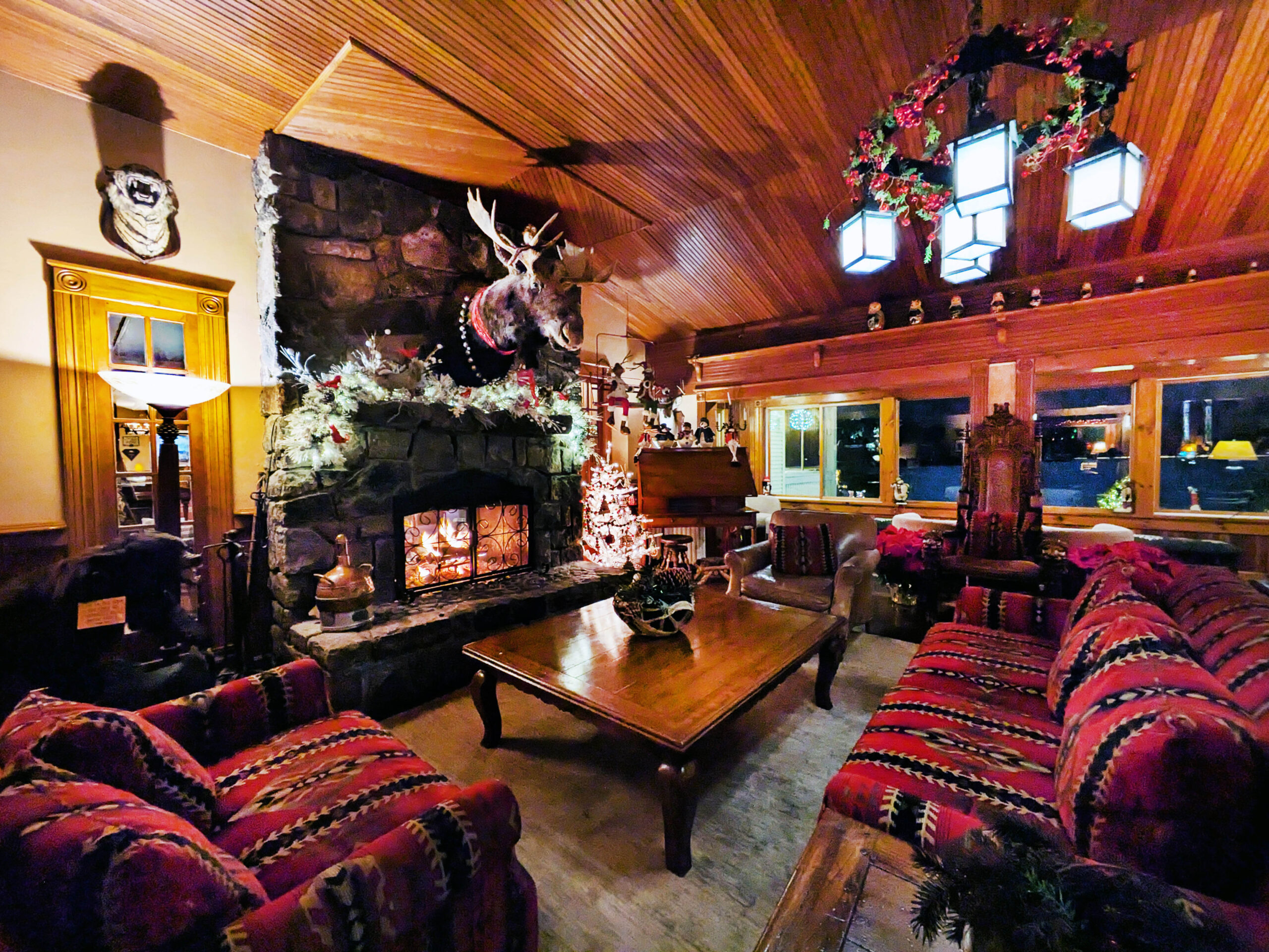 Once inside, you’ll see that Mirror Lake Inn is your classic winter hotel, filled with cozy lounges, warm fireplaces and dining throughout. The hotel features 55 different Christmas trees, each decorated in its own unique style. Naturally, the walls are adorned with moose—standing by to listen if you need to vent and aren’t seeking ‘helpful’ advice in return.