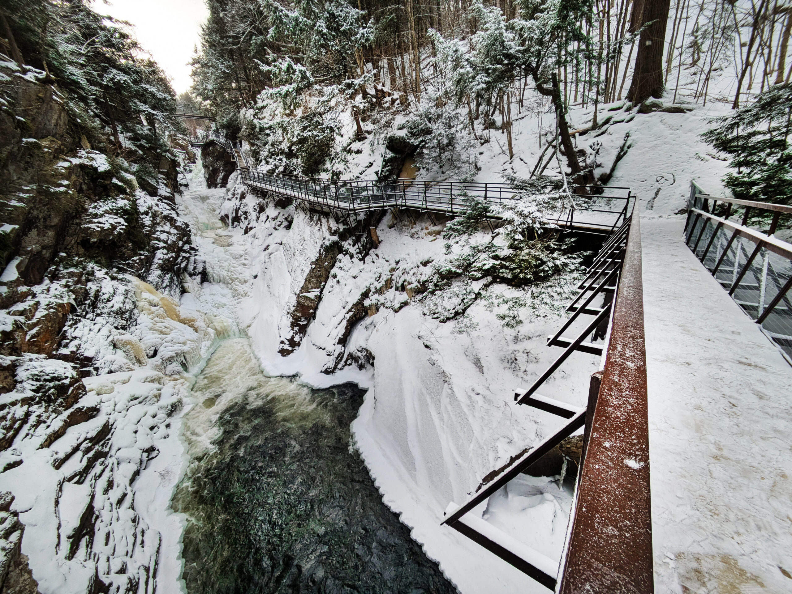 Just outside of town is the High Falls Gorge. This breathtaking natural site features four waterfalls that rush between the canyon rocks around them, with hiking trails and bridges that crisscross over the flowing waters below. The excursion could be done in approximately thirty minutes, but the countless vistas and photo ops are worth the extra time along the way. The gorge is open year-round, although there’s something particularly special about catching this spectacle during the winter season when the water is surrounded by snow and ice. It’s cold, but it’s worth it.