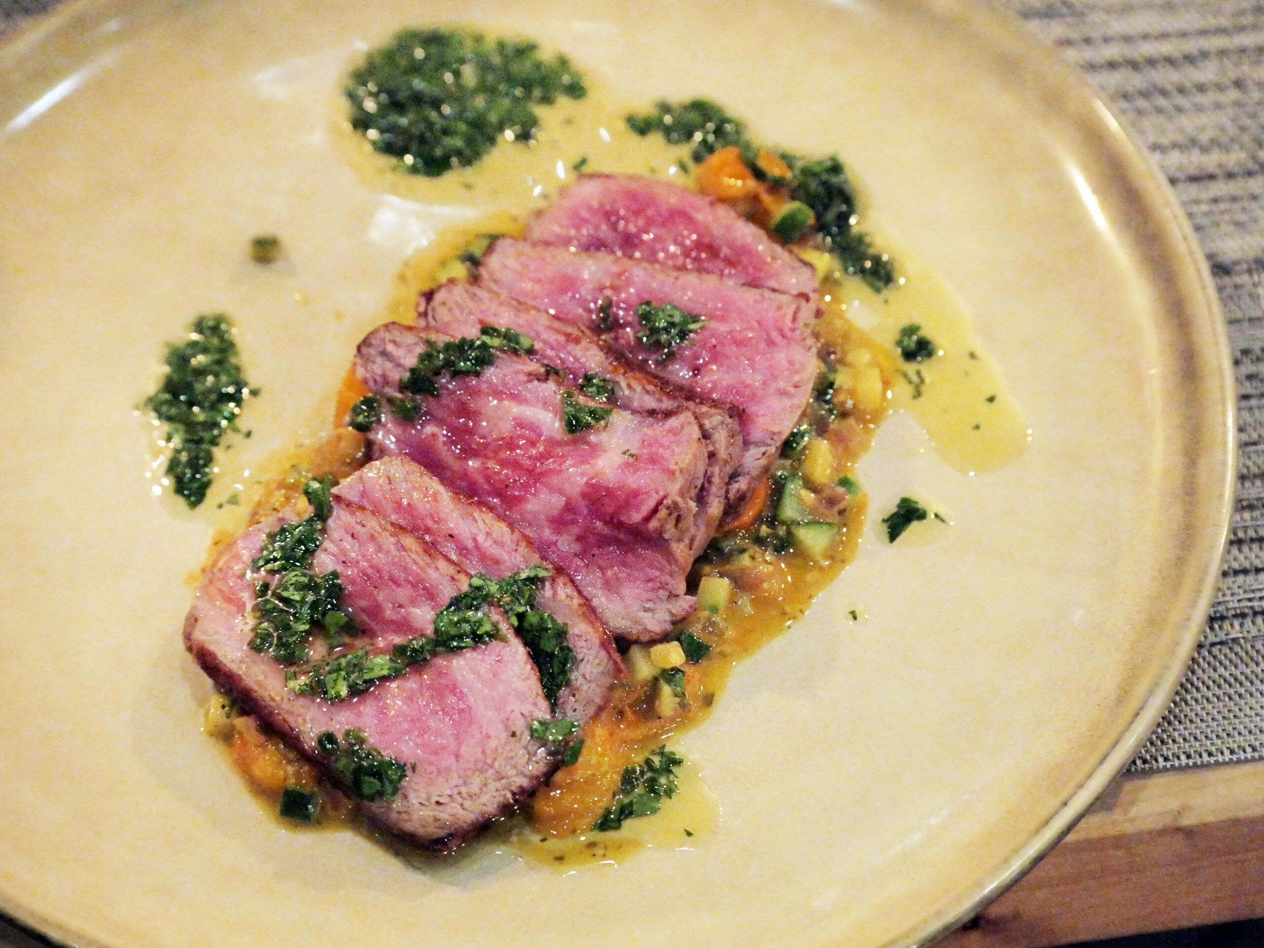 There is no posted menu, no preview online. Guests don’t know what they will eat until the plates are placed in front of them. And as each course arrives, so do the Kings, serving the meal and describing the course. At the Monday night dinner in August that we had the pleasure of attending, after Emily’s homemade honey wheat bread, we were served a salad of crisp, fresh lettuce topped with “absolutely incredible seared filet mignon” and shaved Parmigiano Reggiano, aged 24 months; there was a chili lime vinaigrette on the side.