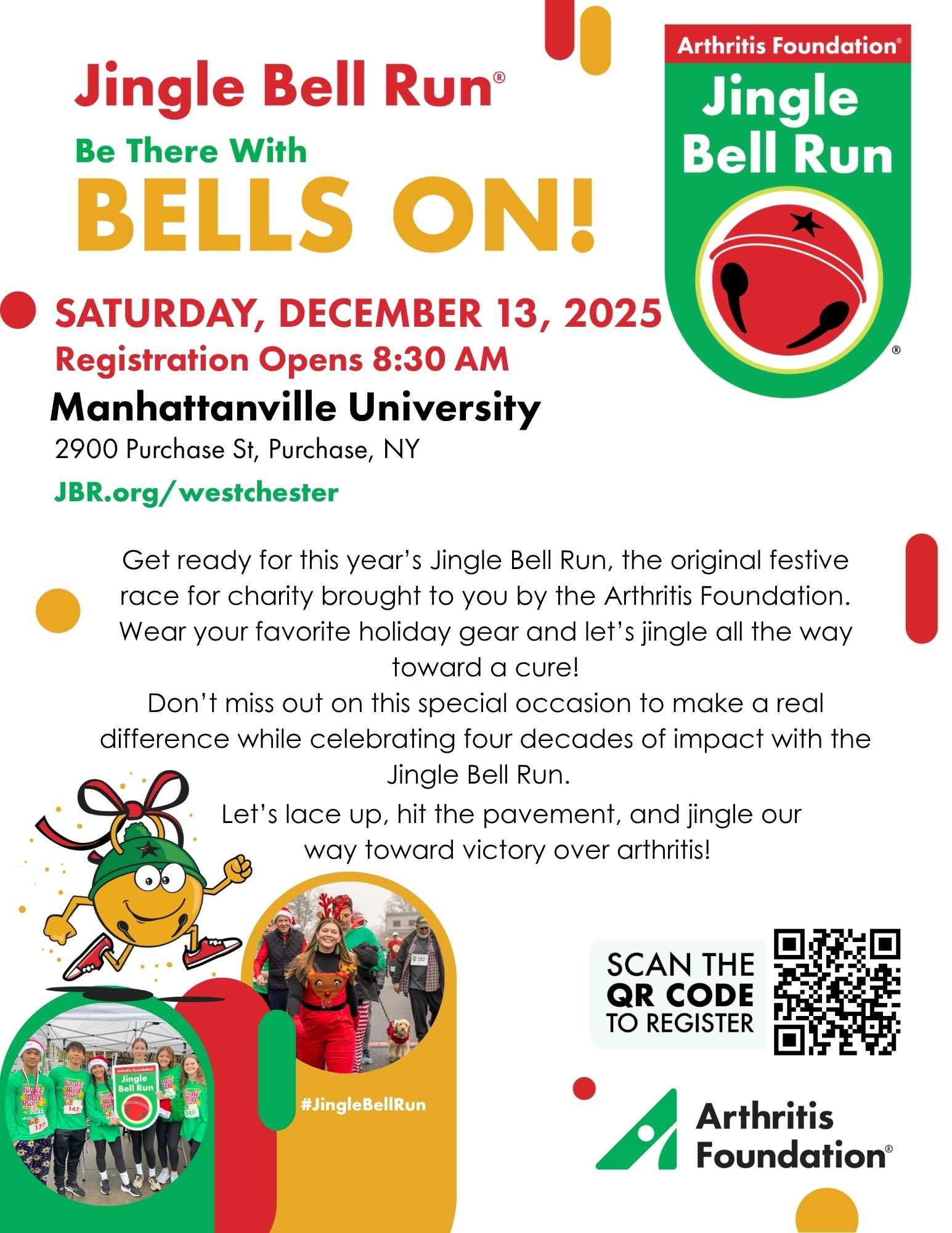 Please join us on Saturday December 13th from 9 am – noon at Manhattanville University for the annual Arthritis Foundation Jingle Bell Run, presented locally by Northwell Orthopedics! Timed & untimed 5K, entertainment, refreshments, vendors, kid’s activities, Santa & Mrs. Claus, and other holiday festivities! Help support the 1 in 4 Westchester residents suffering from over 100 forms of arthritis.