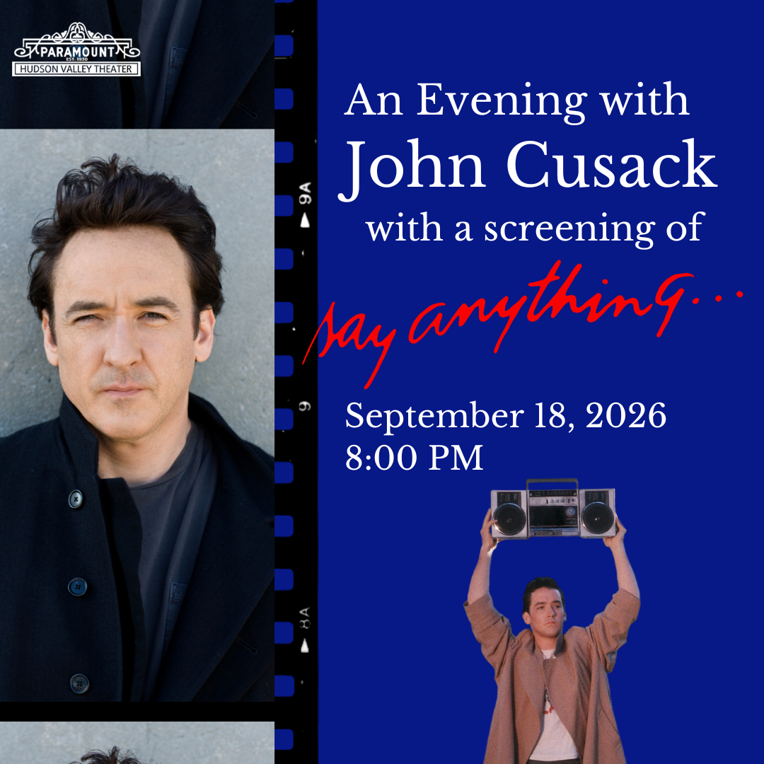 Spend an unforgettable evening with John Cusack at Paramount Hudson Valley Theater on September 18 for a special screening of the beloved classic Say Anything, followed by a live audience Q&A with the star himself. Relive the romance, humor, and iconic moments—including the legendary boombox serenade—that helped define a generation, then hear firsthand stories and reflections from Cusack about the film and his remarkable career. Cusack first captured audiences’ hearts with Say Anything and other ’80s favorites before going on to become one of Hollywood’s most versatile actors, earning acclaim for standout performances in films like High Fidelity, Being John Malkovich, Grosse Pointe Blank, and Love & Mercy. Over a career spanning more than three decades, he has seamlessly moved between comedy, drama, and thrillers, building a body of work that continues to resonate with audiences around the world. Limited VIP tickets that include a post-show Meet & Greet with John Cusack are available. Don’t miss this rare opportunity to experience a beloved classic on the big screen and spend an evening with one of its most iconic stars!