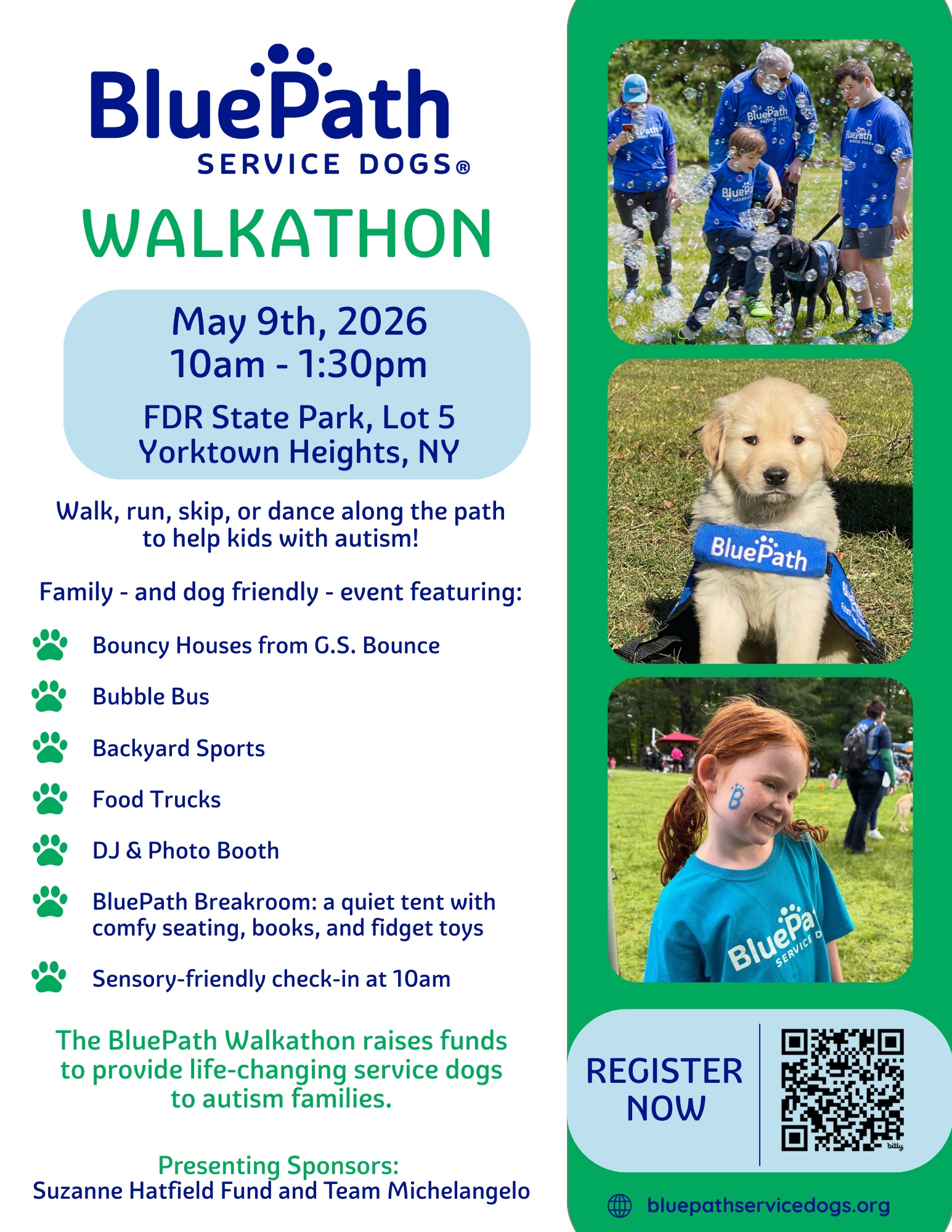 Join BluePath at its 10th Annual Walkathon on Saturday, May 9, 2026, from 10:00 am – 1:30 pm at FDR State Park – Lot 5 in Yorktown Heights, New York. This family and dog-friendly event raises funds in support of BluePath’s mission to provide autism service dogs, offering safety, companionship, and opportunities for independence – free of charge!