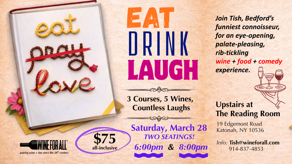 Join Tish, Bedford’s own Recovering Wine Critic, on Saturday, March 28 for a mold-smashing food, wine and comedy experience featuring hyper-local pairings in a cozy upstairs salon.