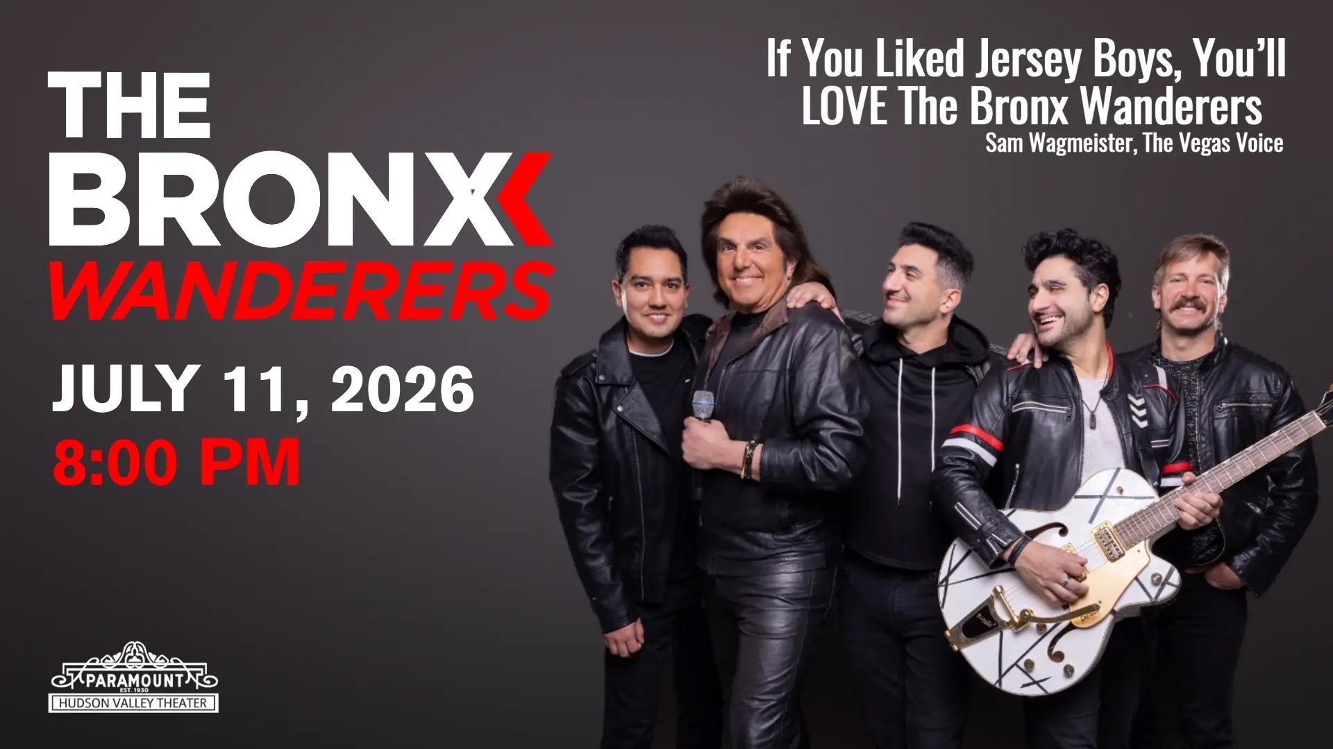 Seemingly pre-destined to form, The Bronx Wanderers have become one of the top shows in Las Vegas, holding a residency for eight years and earning a Top 10 ranking among 256 shows. They have won the Best of Las Vegas Award 12 times and were inducted into the East Coast Music Hall of Fame. Actor Chazz Palminteri sums it up best: “Whenever I’m in New York, I stop at two places. Gino’s Pastry Shop for Cannoli’s and then find out where the Bronx Wanderers are playing.” Their chemistry, energy, and joy prove that after 20 years, they’re still having the time of their lives—and audiences will too when they take the stage at Paramount Hudson Valley Theater on July 11.