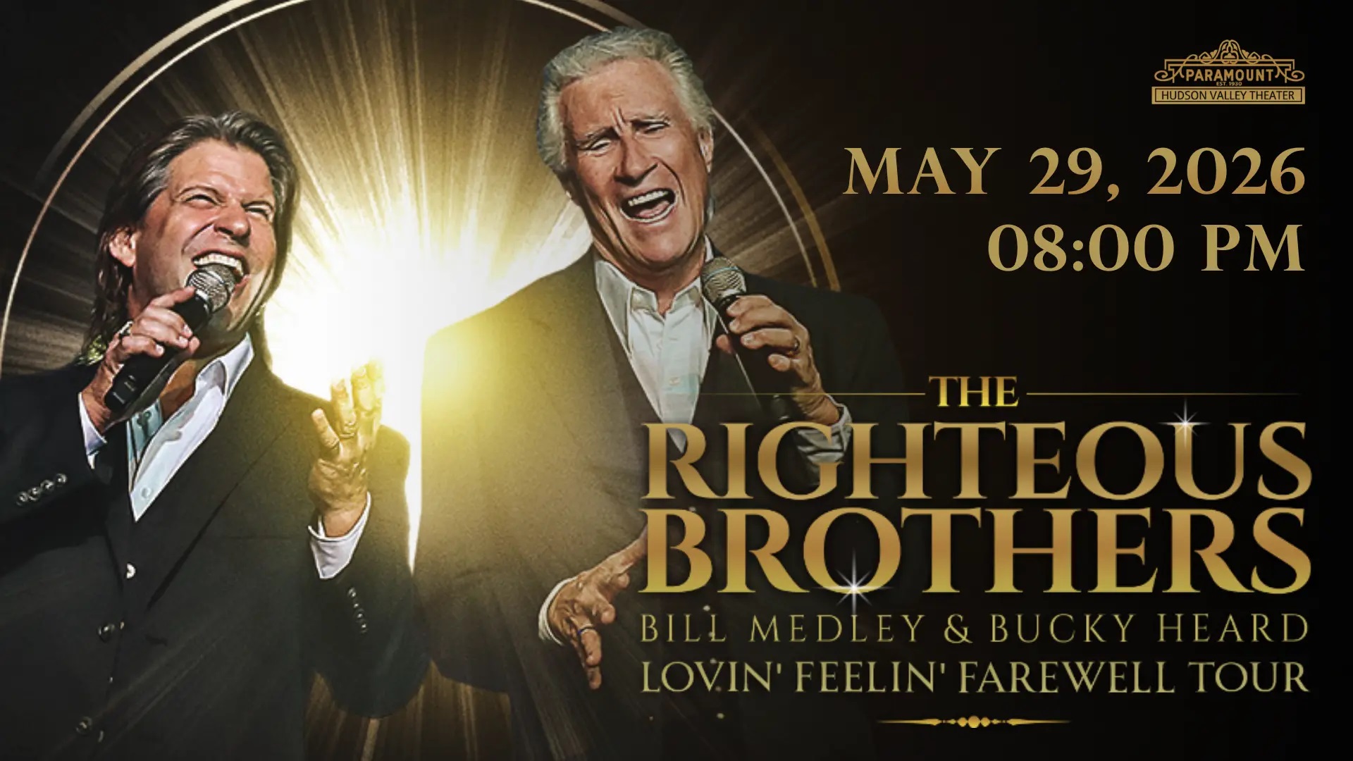 Get ready for an unforgettable night as the legendary Righteous Brothers: Bill Medley & Bucky Heard bring their Lovin’ Feelin’ Farewell Tour to the Paramount Hudson Valley on May 29. This once-in-a-lifetime performance invites audiences to experience the soaring vocals, emotional depth, and timeless sound that helped define the very best of American music. For more than six decades, Bill Medley’s iconic bass-baritone and the unmistakable harmonies of The Righteous Brothers have shaped the soundtrack of generations. Joined by powerhouse vocalist Bucky Heard, the duo takes fans on a musical journey through the early days of rock and roll, the rise of Blue-Eyed Soul, and the unforgettable moments tied to film, television, and pop culture. The evening features a full slate of the hits that made them legends—“You’ve Lost That Lovin’ Feelin’,” “Unchained Melody,” “(I’ve Had) The Time of My Life,” “Soul and Inspiration,” “Ebb Tide,” “Rock and Roll Heaven,” and many more. This farewell tour carries special meaning for Medley, who reflects on a lifetime of music, partnership, and gratitude. “If you had told me, as a 16-year-old kid from Santa Ana, California, that I’d have a 60+ year career in music, I’d have thought you were nuts,” he shares. And on continuing the legacy with Bucky Heard after the loss of Bobby Hatfield, he adds, “I realized I wasn’t ready to give up what Bobby and I created together as The Righteous Brothers. I’ve had the time of my life returning to the stage with Bucky.” These heartfelt sentiments make this final tour not just a concert, but a celebration of a remarkable journey shared with fans across the world. Don’t miss your opportunity to be part of this soulful, nostalgic, and deeply moving farewell celebration. Join us on May 29 for an evening honoring the music, memories, and magic of The Righteous Brothers—Bill Medley & Bucky Heard—live on our stage.