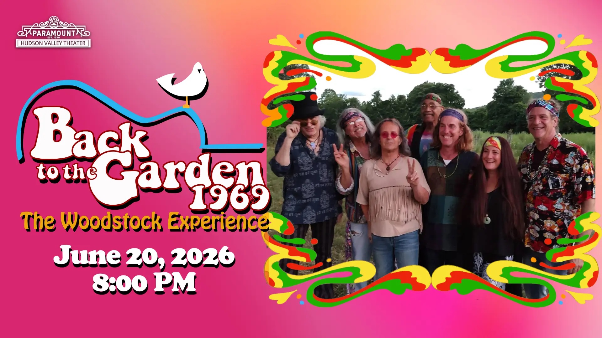 What truly sets Back to the Garden 1969 apart is its immersive, full multimedia theatrical experience. Period costuming, vintage lighting, evocative video, authentic sound bites, and compelling storytelling combine to recreate not just the music, but the moment—the cultural upheaval, the communal energy, and the magic of the late 1960s. From nostalgic Baby Boomers to curious Gen Zers, this is not your typical tribute band—it’s a tribute to a moment in time. So grab your tie-dye and love beads and celebrate Woodstock at the Paramount on June 20.