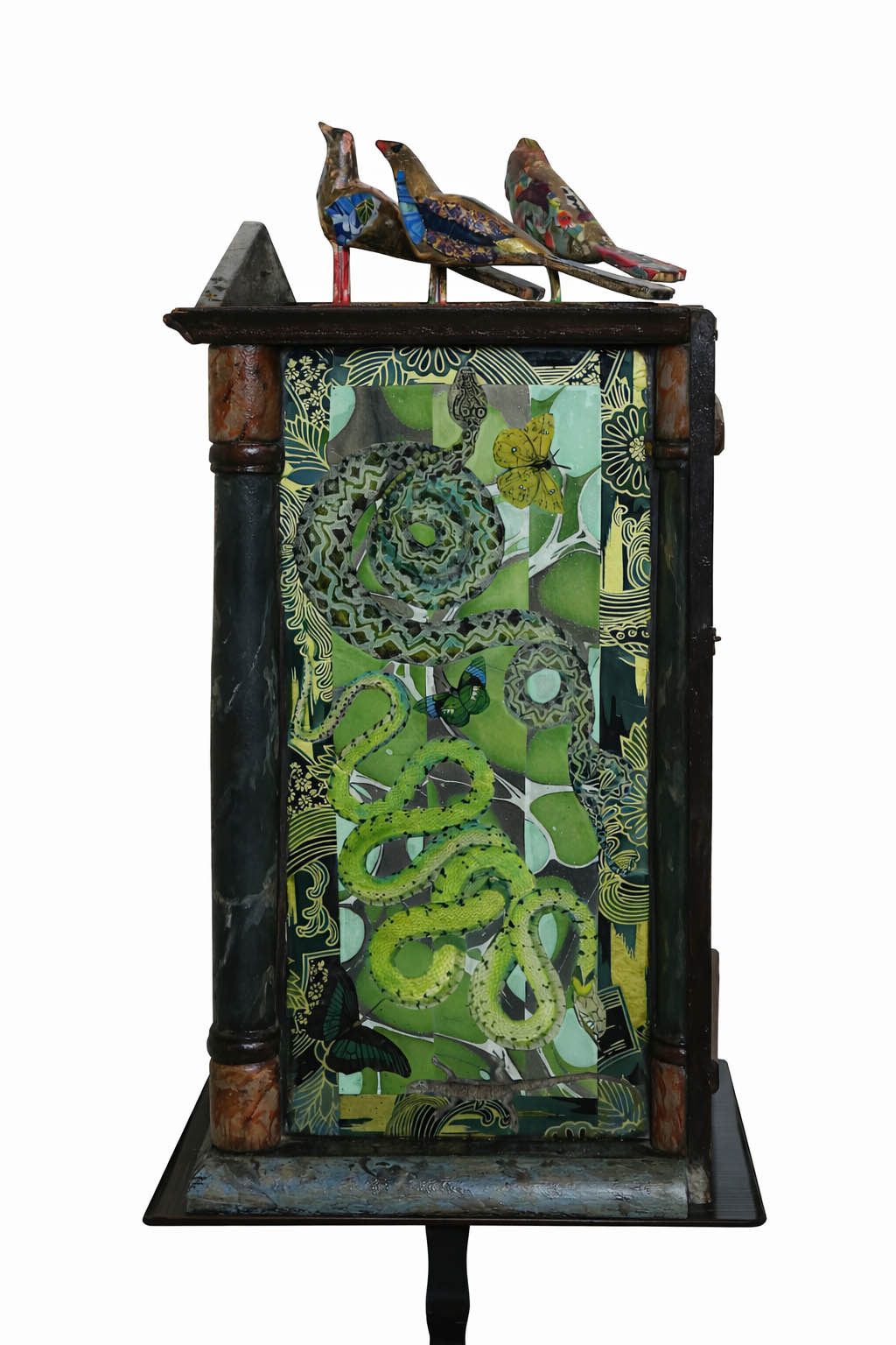 After completing the workshop with Rice, Zinman enrolled in any decoupage class she could find. It wasn’t until one of her teachers retired that she found decoupage artist Lucy Solinsky, who became a friend of Zinman’s. “Lucy taught me how to take my art to another level by looking at each piece as if I am painting with paper,” Zinman says. “I came into this art form feeling like this was a ‘less than’ craft, and quite frankly, there’s a lot of very tacky decoupage out there. Lucy made me feel that I was using paper and images to paint, and that took the art to a different level for me because color, texture (on some surfaces) and the relationships of images to each other gained more meaning. So, the scissor became my paintbrush, and I felt freer to experiment and push boundaries in the art form.”