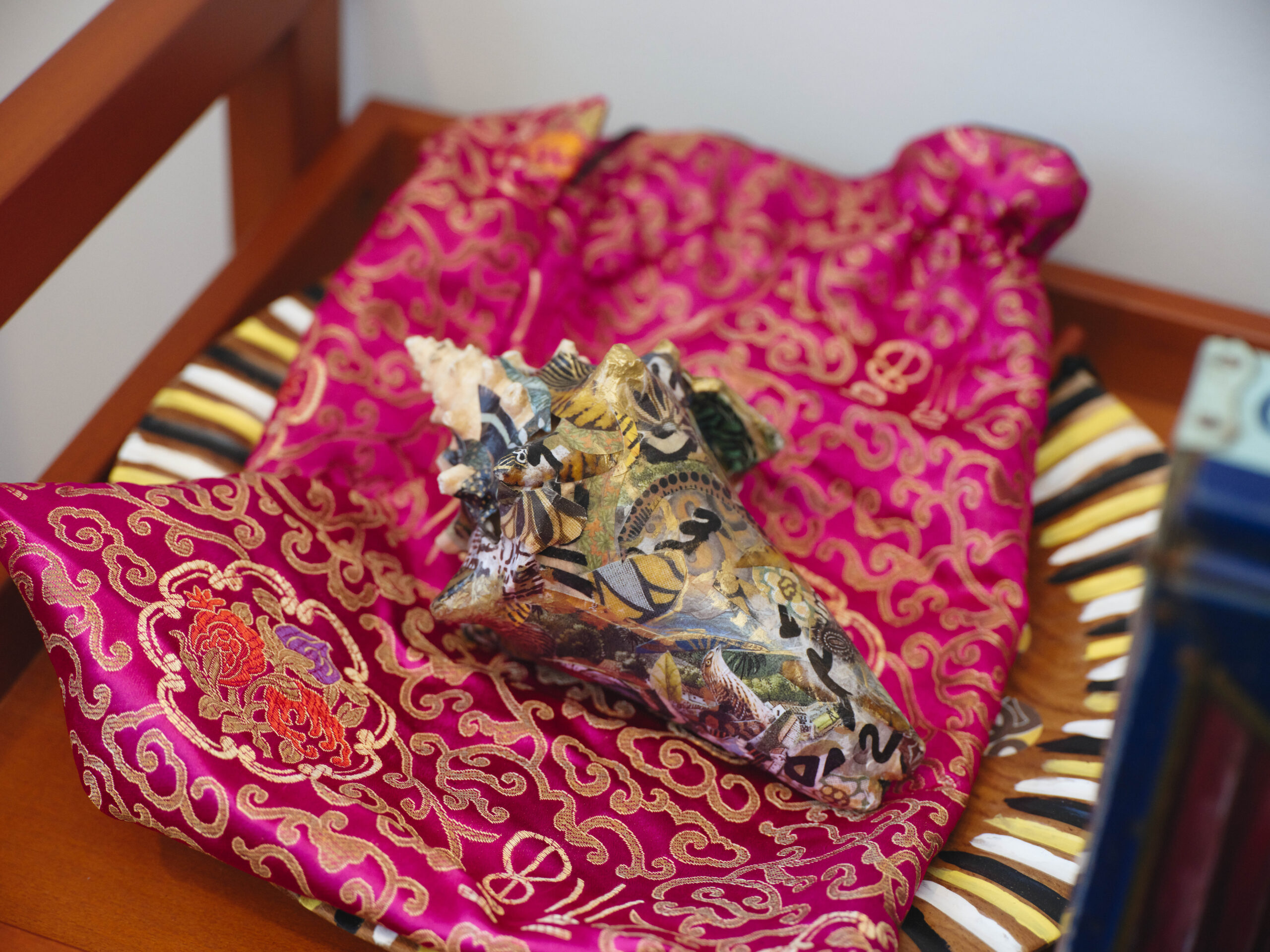 Once the object and images are selected, Zinman heads to her three shelves filled with decoupage paper, mostly from a company called Mulberry Papers, which makes hand-crafted, colorful papers featuring portraits, florals, sea life, architecture, zodiac signs and more. Then, Zinman begins to cut, using a combination of cuticle scissors, small Fiskars scissors and knives with small blades. This process, she says, is very intense and requires precision. “I sometimes have a lot of trouble focusing,” Zinman says. “But when I am cutting, I go into a meditative and relaxing state, where my brain is in a Zen mode.” Finally, it’s time to glue the images, a step that Zinman says cannot be rushed. This phase must be done flawlessly, and the glue can take anywhere from 24 to 36 hours to dry properly before a protective treatment can be applied. As she’s creating these pieces, Zinman keeps herself organized using three different trollies: one for works in progress, another for finished pieces and a third for the final cleanup stage.