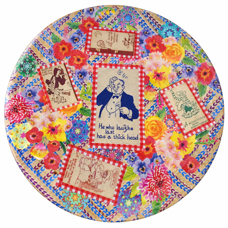 Unlike some artists who devote their attention to a single piece, Zinman prefers to work on multiple objects at a time. “I have collections of images grouped for specific objects,” Zinman says. “I begin by cutting more images than I will use. Then I lay them out and start gluing. While the glue is drying, I move onto another piece. When complete, I finish it with a sealer and sanding.” Zinman describes her method as a fluid process and dreams of the day she will have a studio with a long table, where she can move from piece to piece during their varying stages of completion.